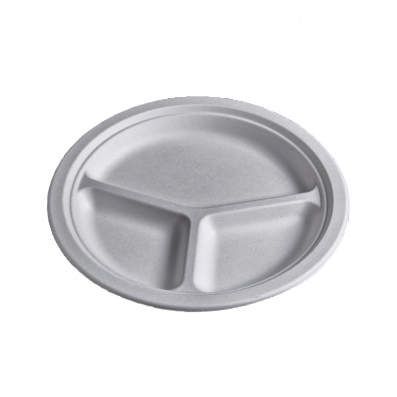 Plat compostable de 26 cm de diàmetre amb 3 compartiments. Color blanc.